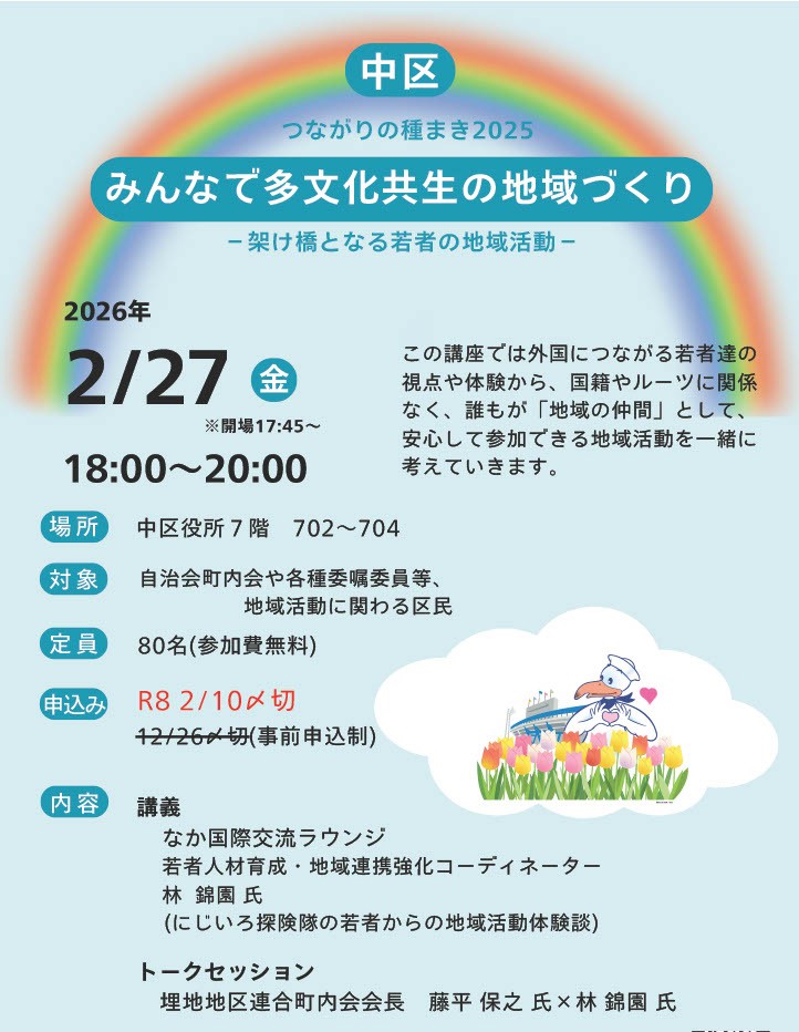 令和8年2月27日(金)に、「みんなで多文化共生の地域づくりー架け橋となる若者の地域活動ー」が中区役所にて開催され、ラウンジスタッフの林さんの講義と、埋地地区の藤平会長とのトークセッションが行われ、多くの方が参加されました。