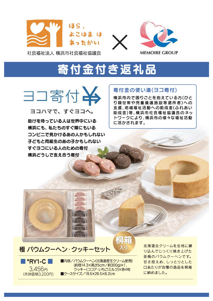 ㈱メモワールが取り扱う葬儀返礼品の一部商品を、寄付付き商品として販売し、その商品の売り上げの一部(1商品200円)を、㈱メモワールから市社協(ヨコ寄付)への寄付金とします。