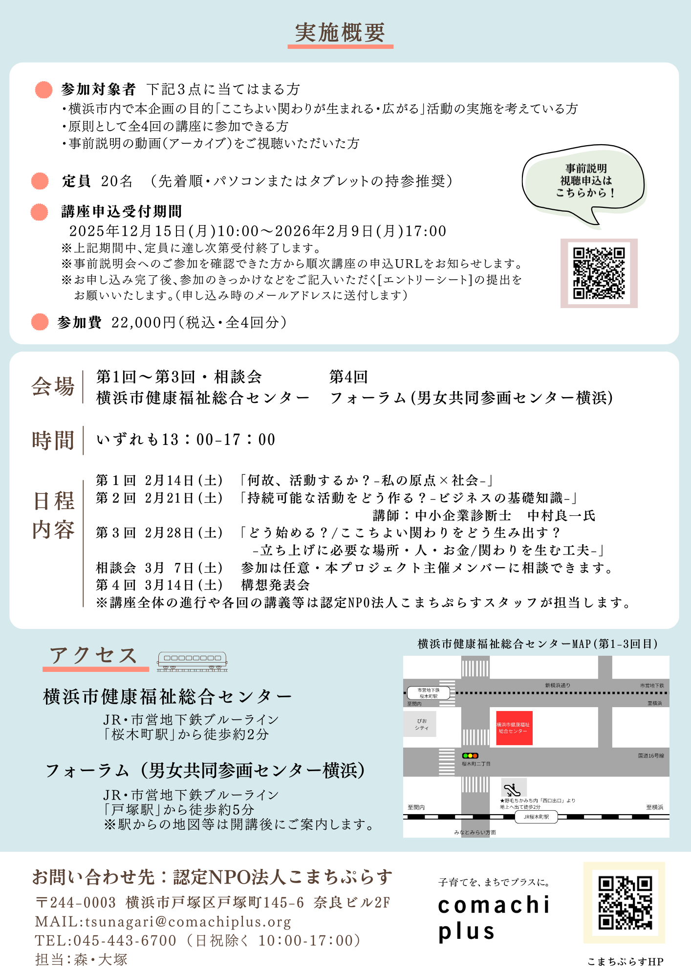 本講座は、認定NPO法人こまちぷらすが事務局となります。お問い合わせ等は下記へ。