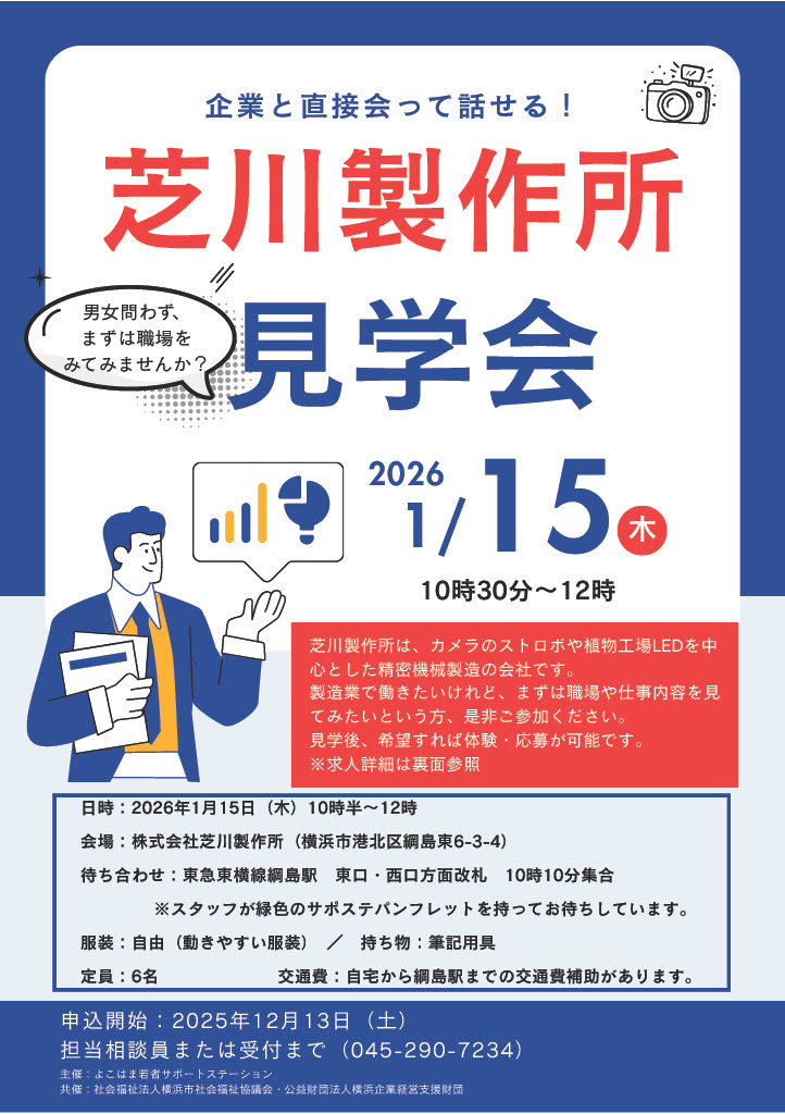 本会では、よこはま若者サポートステーションIDEC(横浜企業経営支援財団)と連携し、若者支援の取組として、令和5年度より「はじめの一歩プロジェクト」を実施しています。
