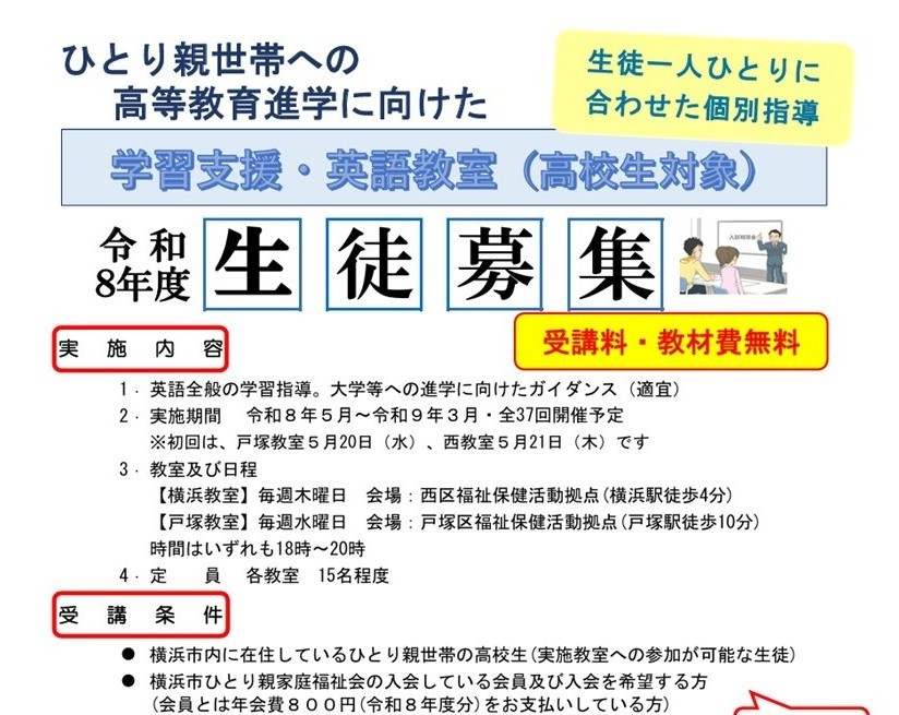 「塾代が高くて通わせることが難しい」というひとり親世帯からの声を受けて、横浜市シルバー人材センター横浜市ひとり親家庭福祉会横浜信用金庫と連携し、令和3年度から当事業を進めています。